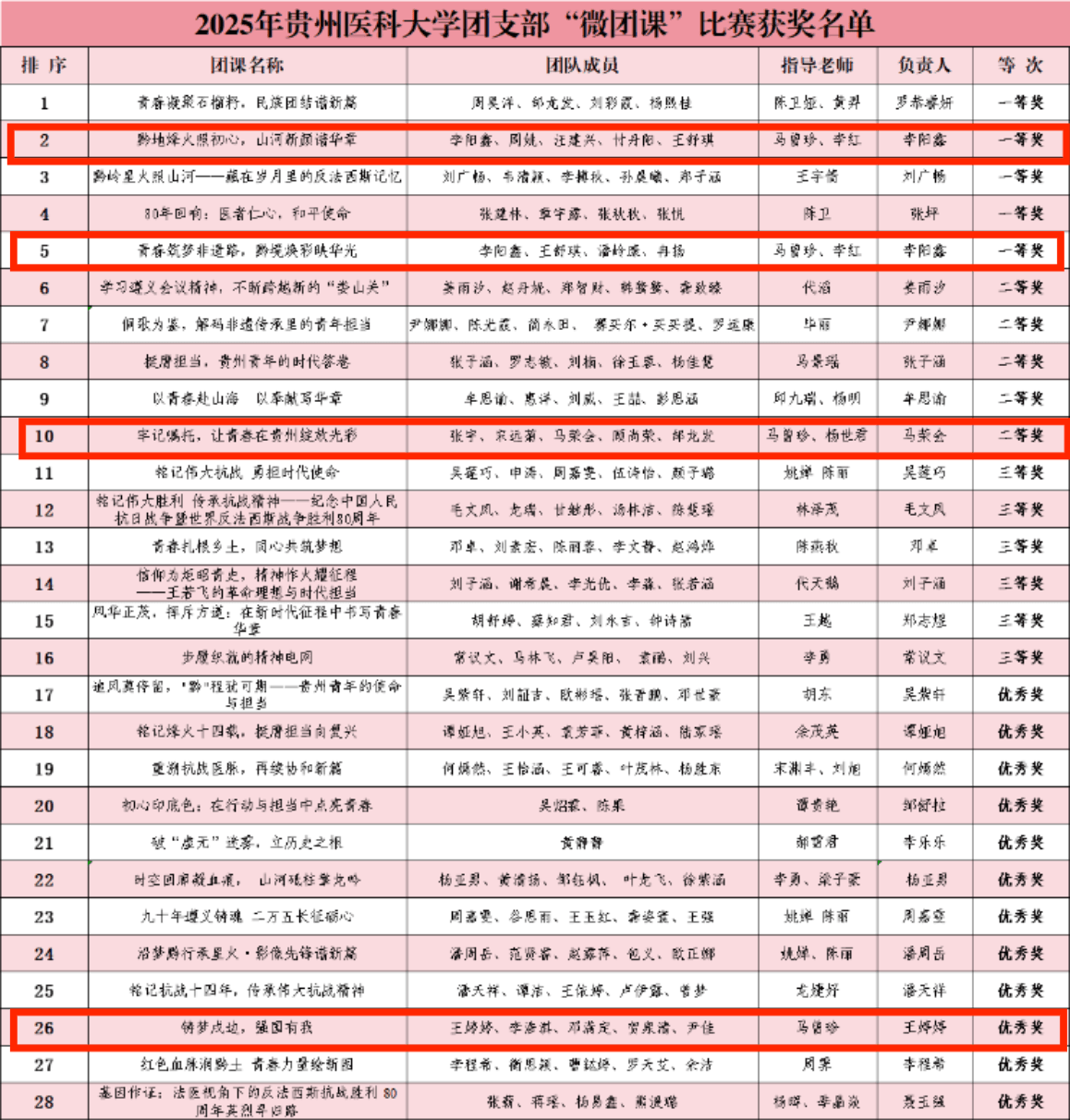 近日,贵州医科大学2025年团支部“微团课”比赛圆满落幕。医学人文学院高度重视、积极筹备,经院内选拔推荐的4份参赛作品,在全校56份作品的激烈角逐中表现突出,最终斩获一等奖2项、二等奖1项、优秀奖1项,充分彰显了学院团员青年的理论素养与青春担当。本次比赛由校团委、宣传部、学工部联合组建评审组,围绕“主题突出、导向正确,内容充实、逻辑清晰,真实自然、共鸣感强”等核心标准开展评审,重点考察作品对习近平总书记...