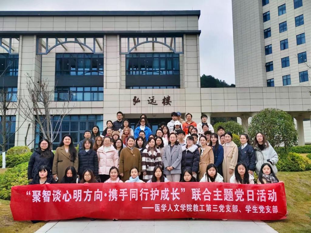 2025年12月9日,医学人文学院教工第三党支部与学生党支部在弘远楼三楼联合举办“聚智谈心明方向・携手同行护成长”主题党日活动,两个党支部共计62人参加,其中48名学生(党员、入党积极分子)分座谈交流组和团体辅导组同步开展活动。座谈交流组以学生需求为导向,前期已向学生发放涵盖基础信息与认知、心理健康服务体验…