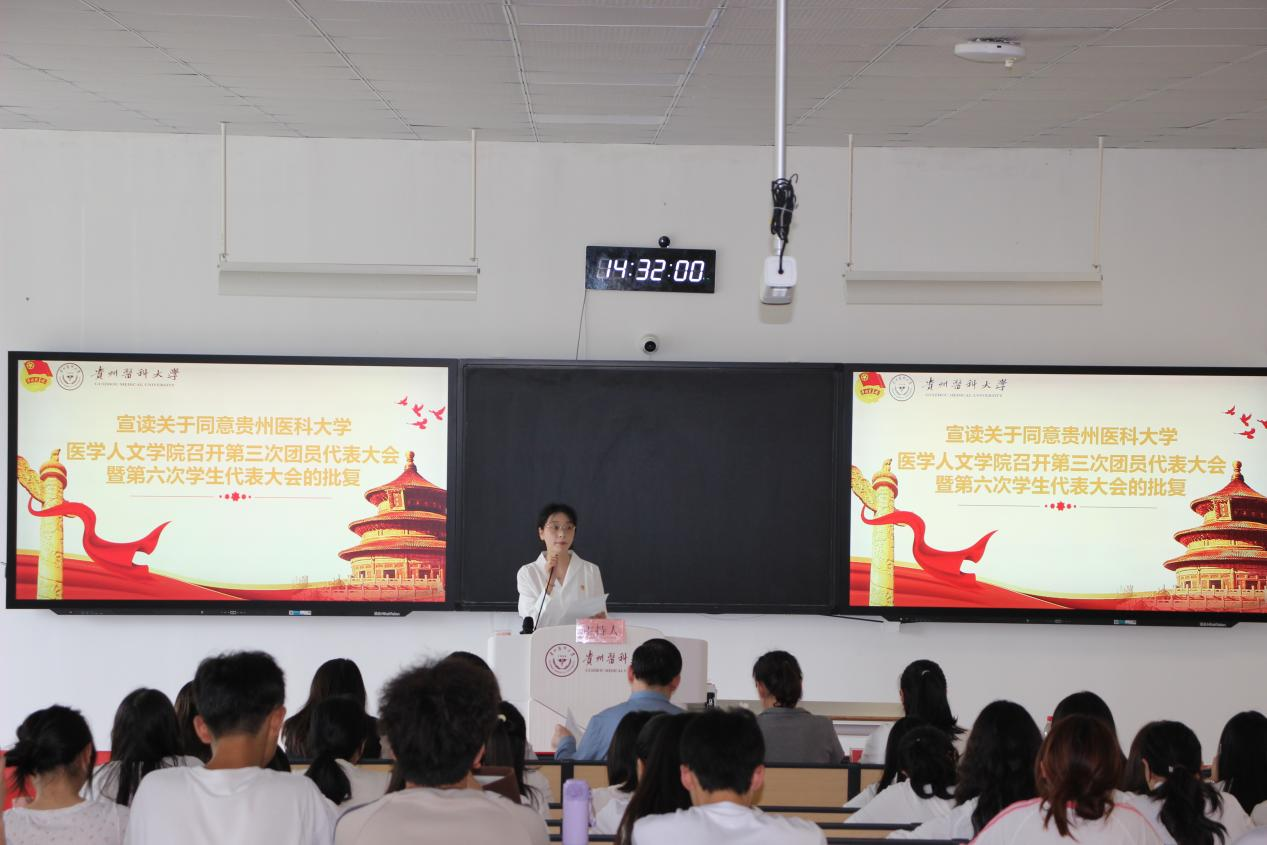 黄莉雯宣读《关于同意召开贵州医科大学医学人文学院第三次团员代表大会的批复》。