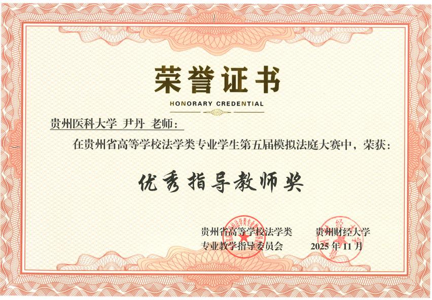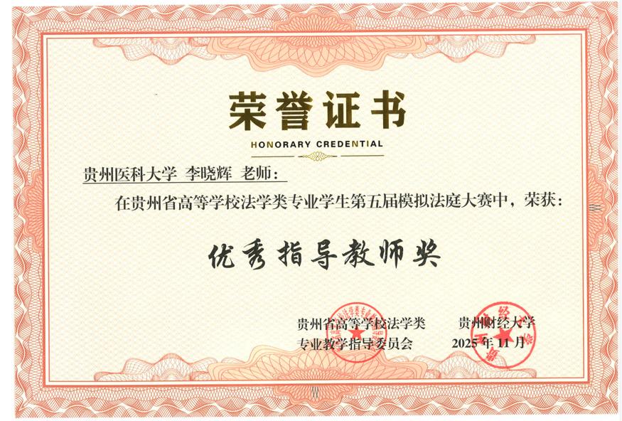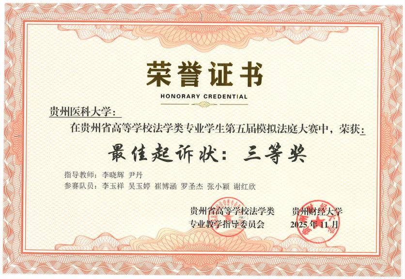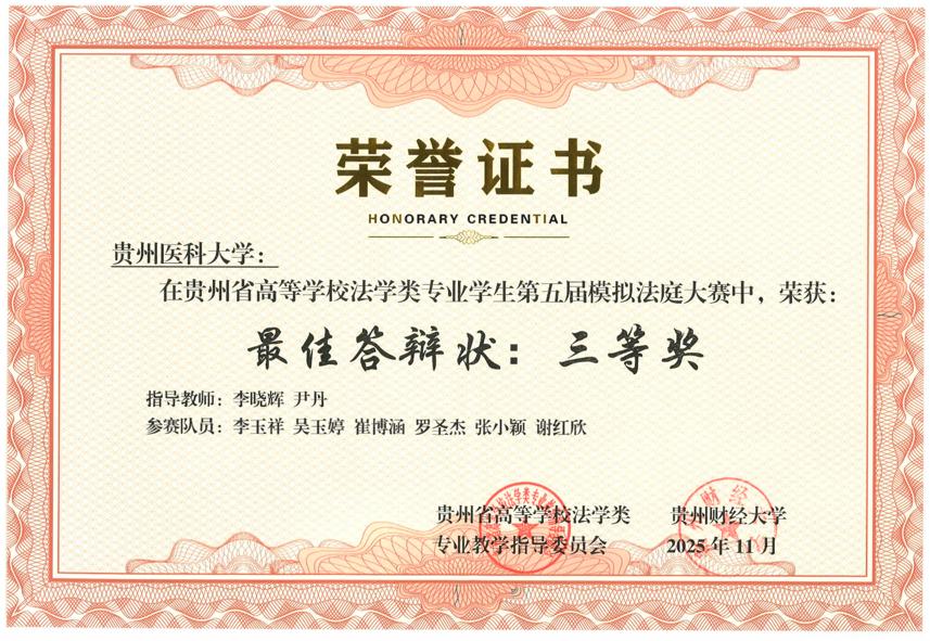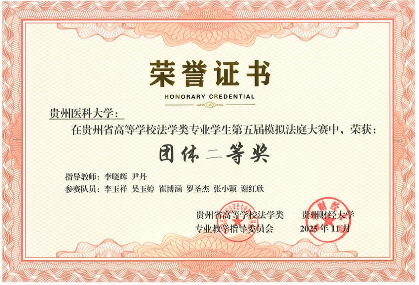 2025年11月22日,贵州省高等学校法学类专业学生第五届模拟法庭大赛在贵州财经大学圆满落幕。我校医学人文学院李晓辉、尹丹两位老师带队指导,李玉祥、吴玉婷、崔博涵、罗圣杰、张小颖、谢红欣6名本科生组成参赛团队,历经初赛、复赛两轮激烈比拼,以总排名第三的优异表现蝉联“团体二等奖”,同时斩获“最佳起诉状三等奖”“最佳答辩状三等奖”两项单项荣誉,李晓辉、尹丹老师获评“优秀指导教师奖”。