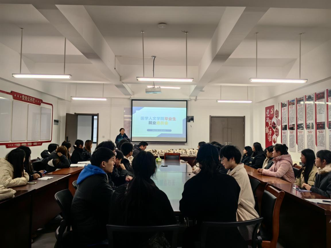 为切实做好毕业生就业工作,帮助学生明确就业方向、增强求职信心,2025年12月4日医学人文学院召开了2026届毕业生就业动员会。学院党委副书记马琳娜、学院团委书记马曾珍和2026届毕业生参加。会议由毕业班辅导员李红主持。