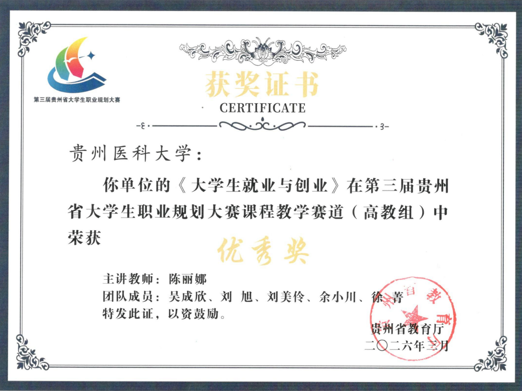 此次成绩的取得,是贵州医科大学长期以来高度重视学生职业发展与就业指导工作的具体体现,也展示了教研室教师团队扎实的教学功底和协同创新的精神风貌。学院将以此次获奖为契机,进一步深化就业指导课程改革,提升课程教学质量,助力学生更高质量就业与全面发展。